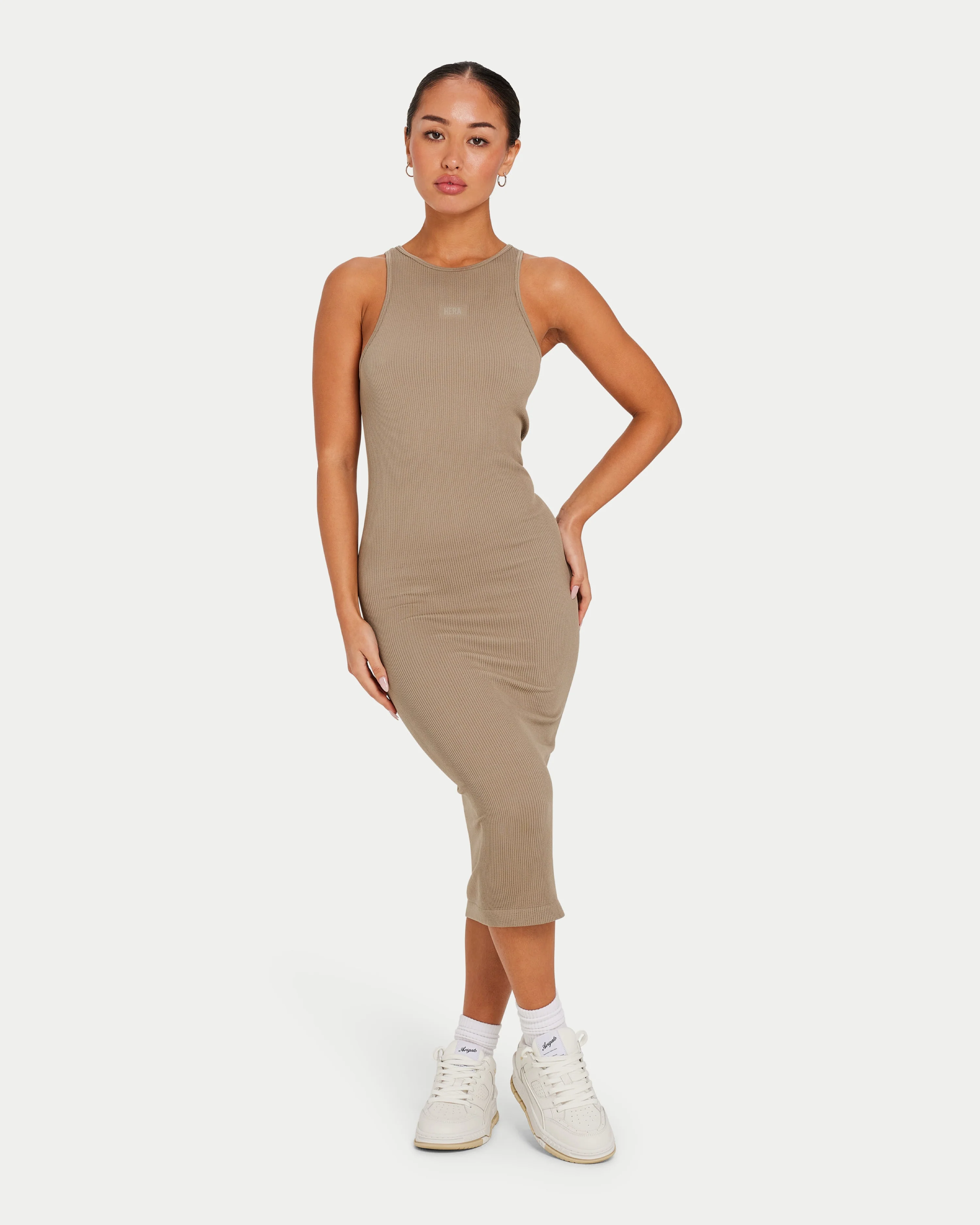 The Ribbed Base Race Midi Dress is a form-fitting dress made in a super soft ribbed fabric. The logo is printed for a subtle but premium finish. Â